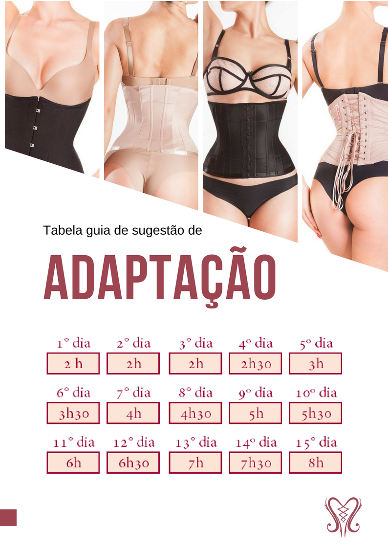 NOTA: Esta tabela de 21 dias particularmente acho a mais tranquila para se fazer pelo tempo mesmo. Ela da mais chances ao seu corpo de se acostumar com a peça (seja ela um corset ou um modelador estruturado de elástico). As sugestões com menos tempo acho mais interessante para aquelas que já estão habituadas a usar peças de alta compressão, estão acostumadas com o aperto. De qualquer forma, tenha em mente que cada corpo é único, faça a adaptação gradualmente e respeite seu corpo.